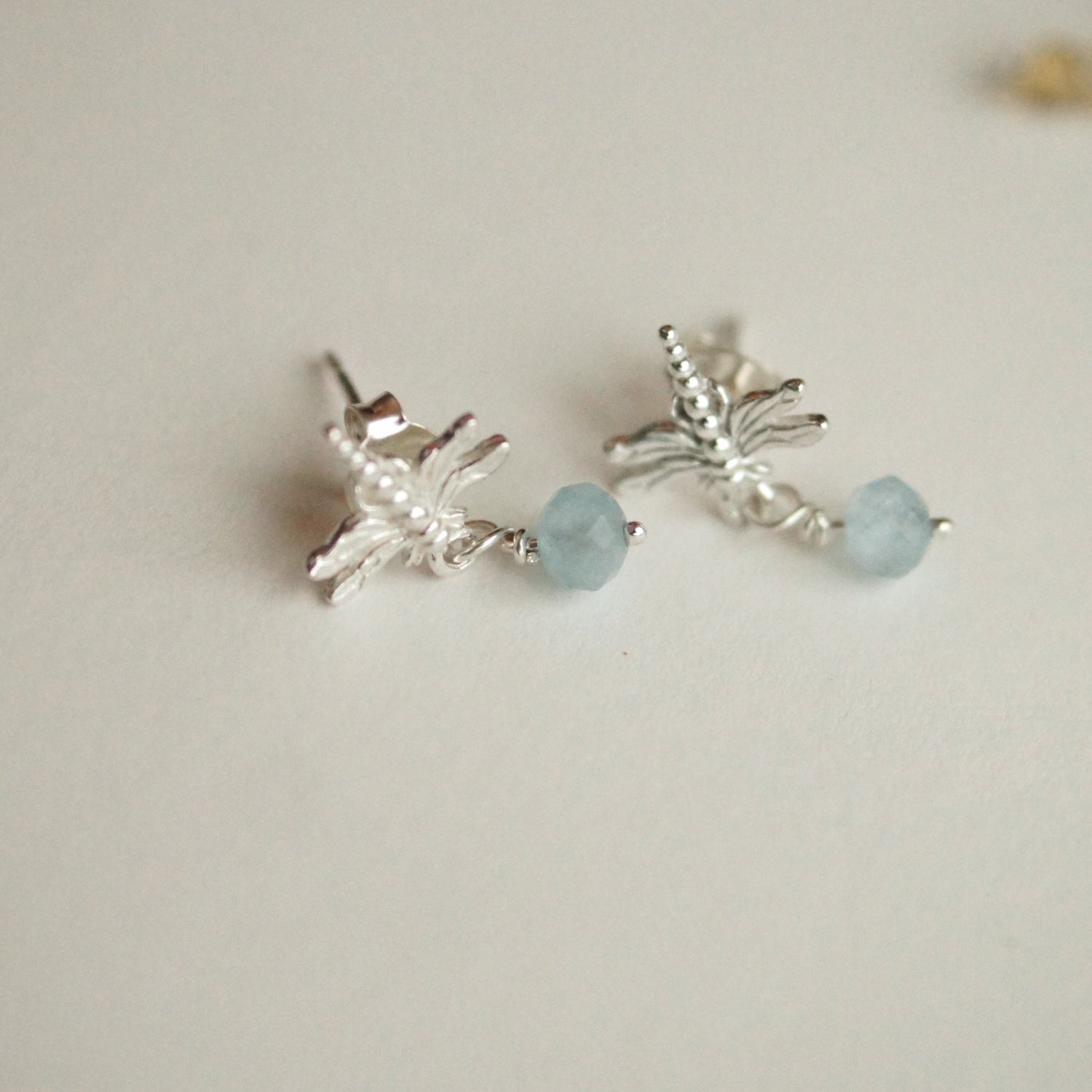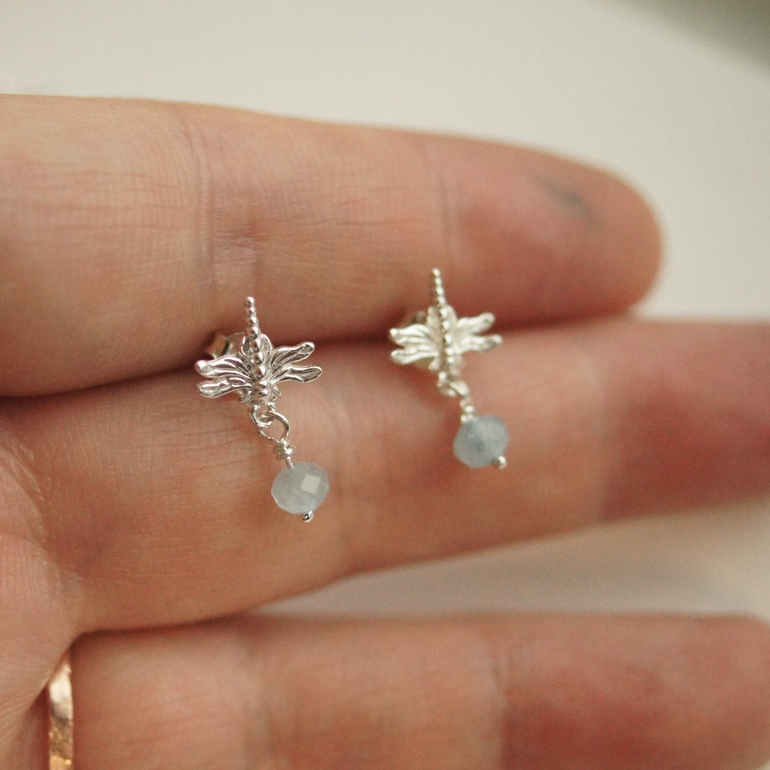 Solid sterling silver earrings on sterling silver posts with aquamarine gemstone beads dangling. Tiny dragonfly measures 9mm across.