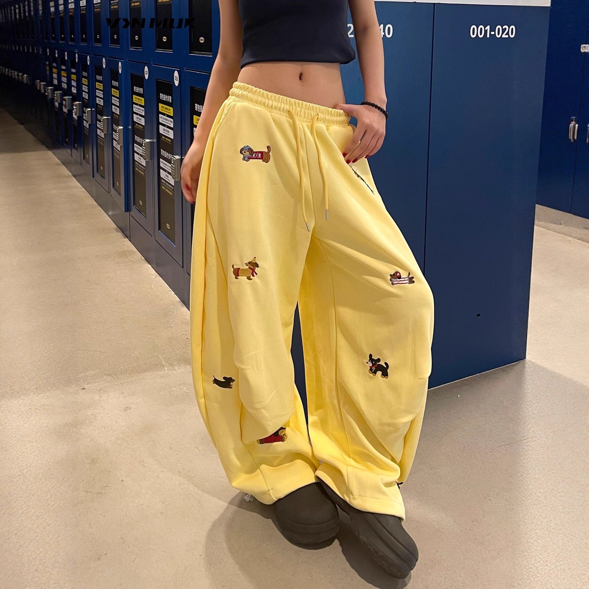 Women's embroidered wide leg pants in navy blue – front view Loose drape wide leg trousers in grey – side profile Embroidered detail close-up on women's wide leg pants Women's yellow wide leg pants – full length street style look Elastic waist detail on women's loose fit trousers Wide leg pants styled with casual top – street outfit Women's embroidered slacks in navy – back view Drape wide leg pants flat lay – all three colour options Women's loose fit cotton trousers – lifestyle shot