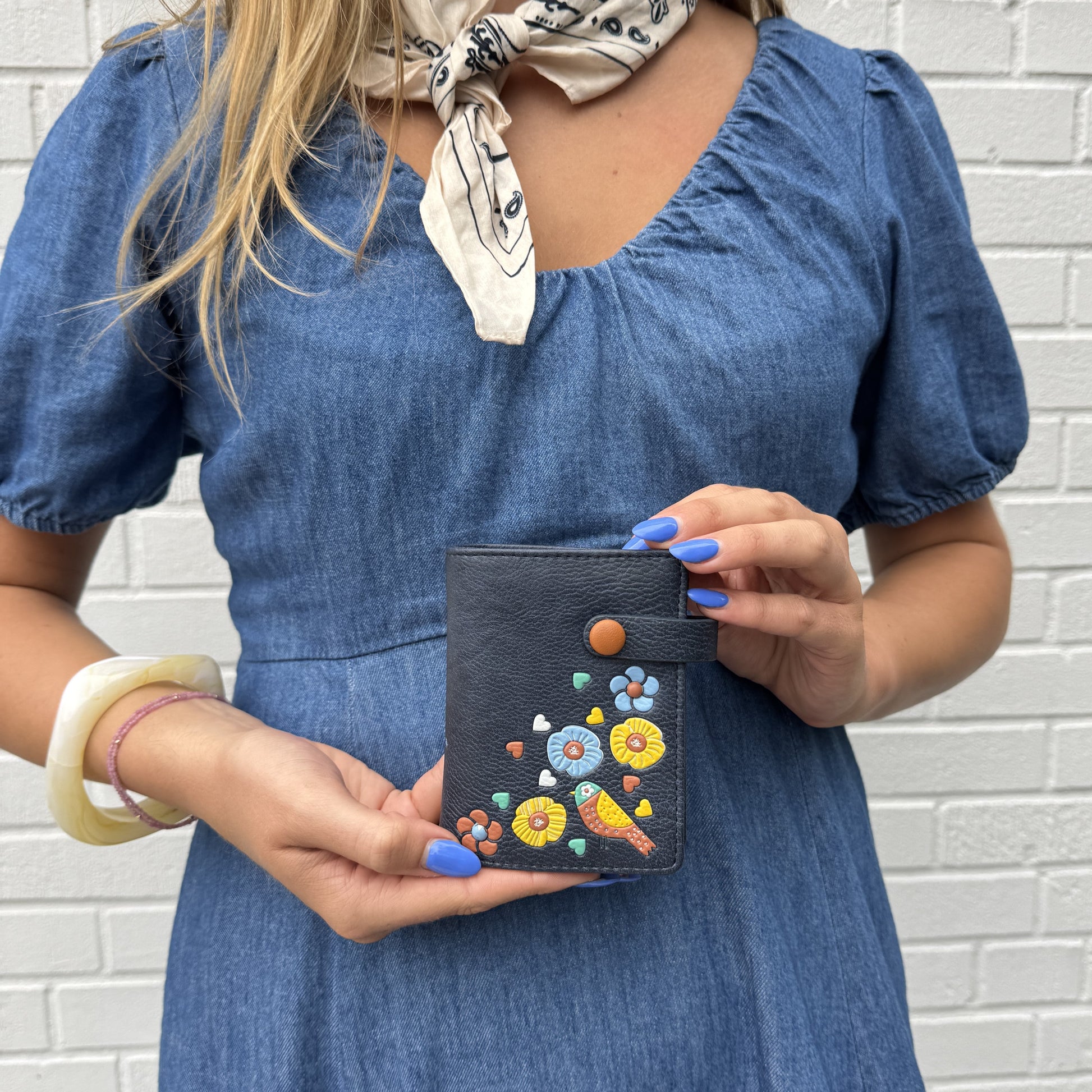 This compact vegan leather wallet with RFID protection features a charming design with a cute bird nestled among blooming flowers. Despite its small size, it offers plenty of room for cards and cash while still fitting easily into smaller bags for everyday convenience. Crafted from pebbled vegan leather, it has an elevated, stylish look that adds a little joy every time you reach for it.