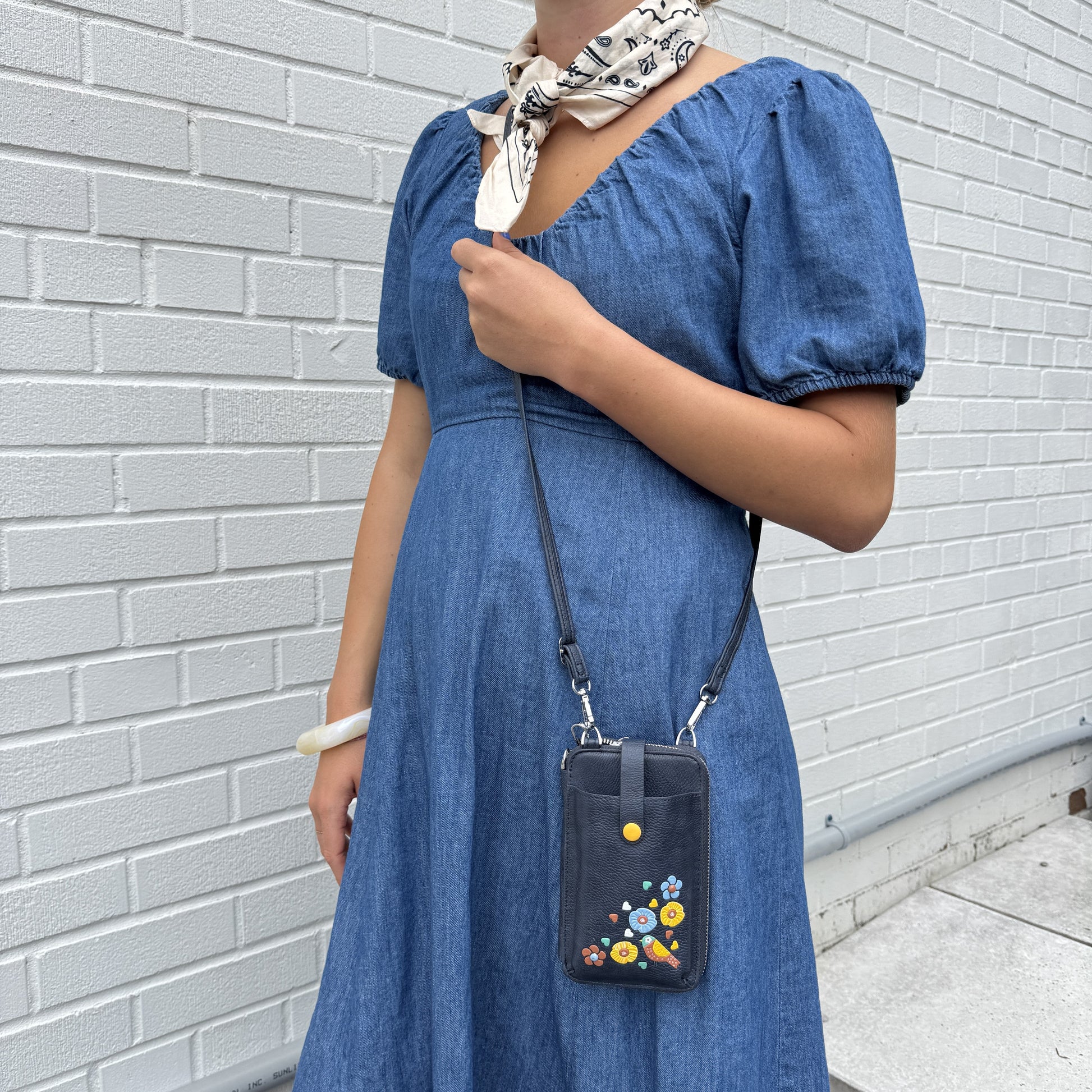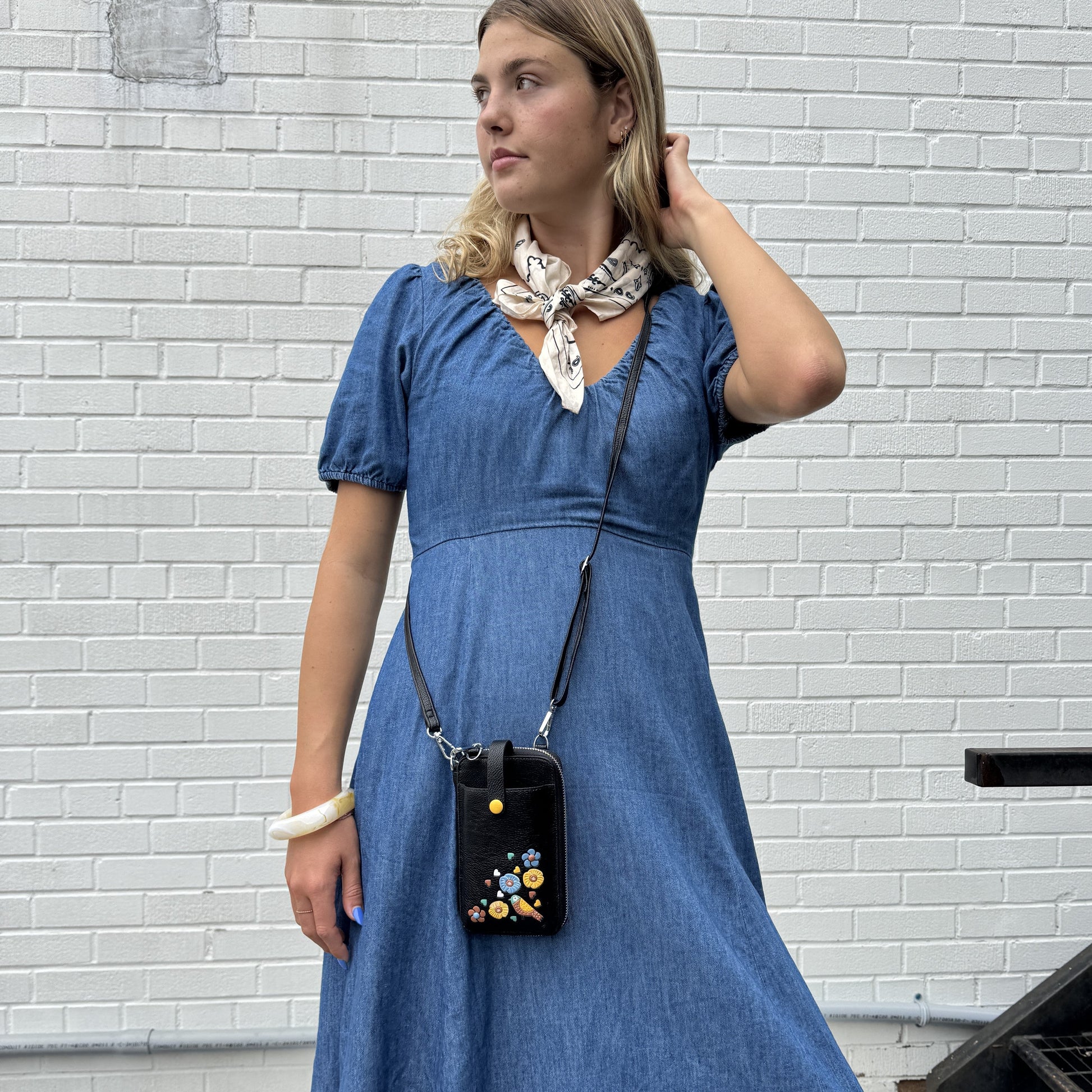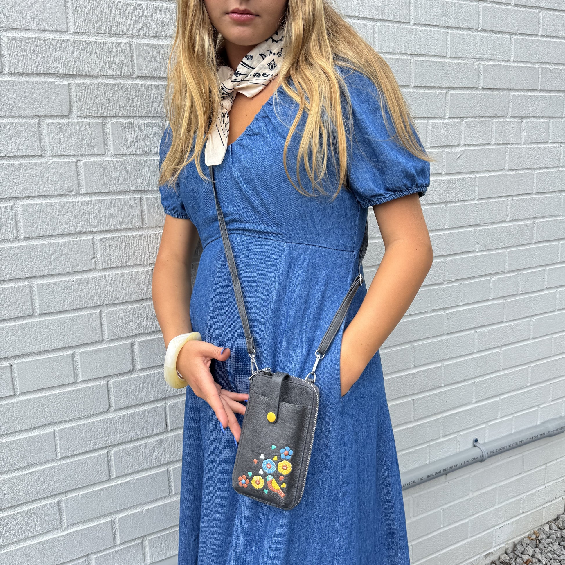 These gorgeous boho vegan floral appliqués with RFID protection adorn this multi-functional vegan leather smartphone pouch. This versatile design can be worn as a small crossbody, carried as a clutch with the wrist strap, or used as a wallet inside a larger bag. Compact, stylish, and practical, it’s the perfect everyday accessory for hands-free convenience.