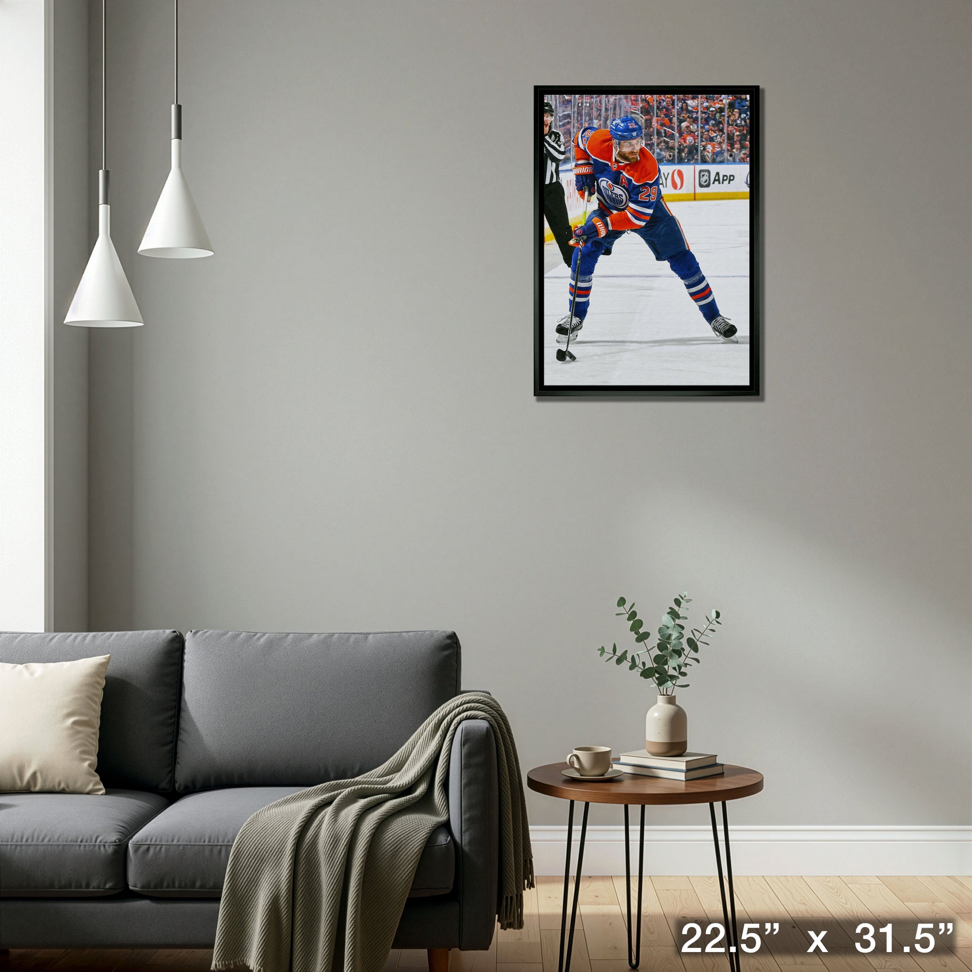 This image of Leon Draisaitl is printed on high quality art canvas and then professionally stretched and framed. This canvas is officially licensed by the National Hockey League (NHL) and National Hockey League Players Association (NHLPA). Made in Canada. Finished Size: 22.5 x 31.5"
