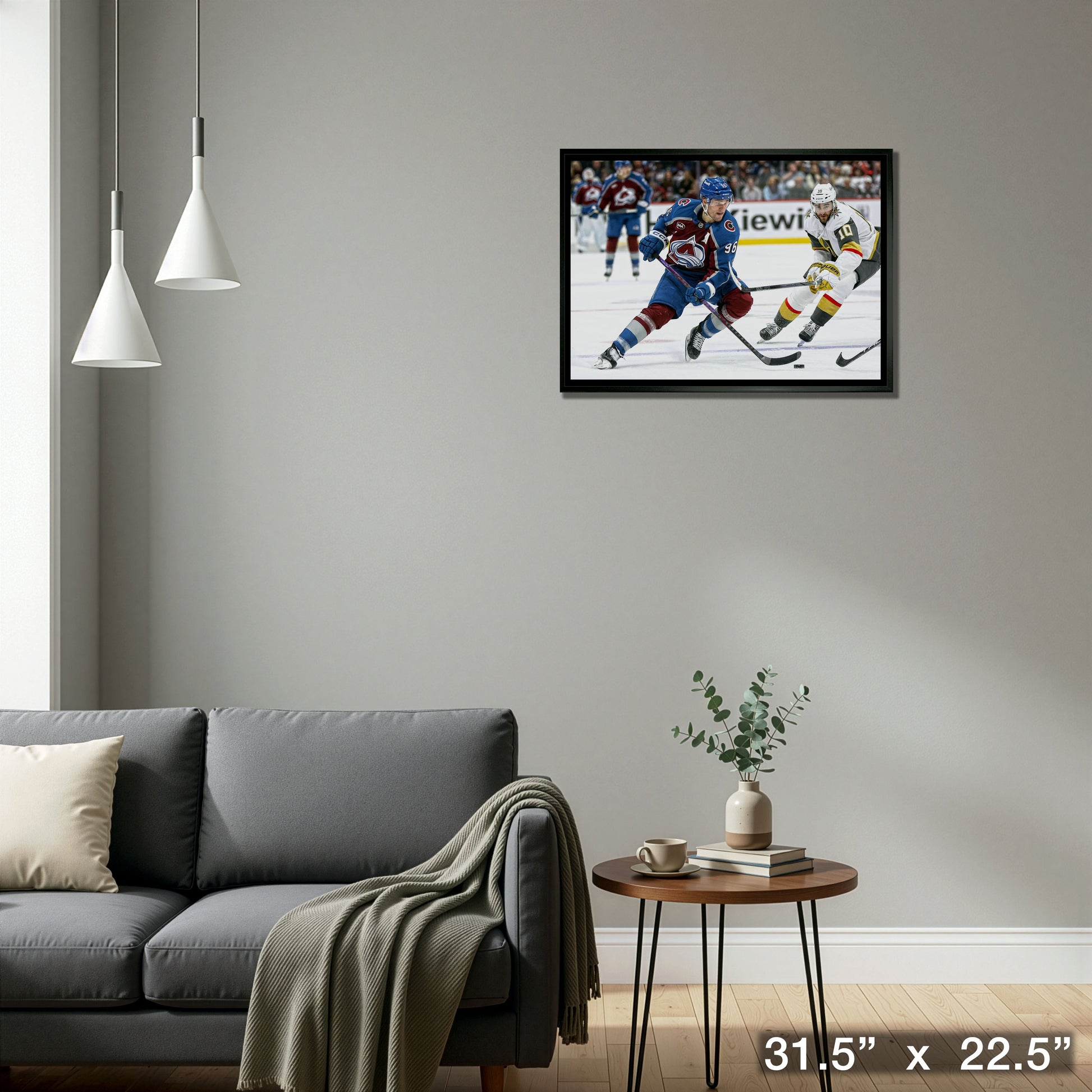 This image of Mikko Rantanen is printed on high quality art canvas and then professionally stretched and framed. This canvas is officially licensed by the National Hockey League (NHL) and National Hockey League Players Association (NHLPA). Made in Canada.. Finished Size: 31.5 x 22.5"
