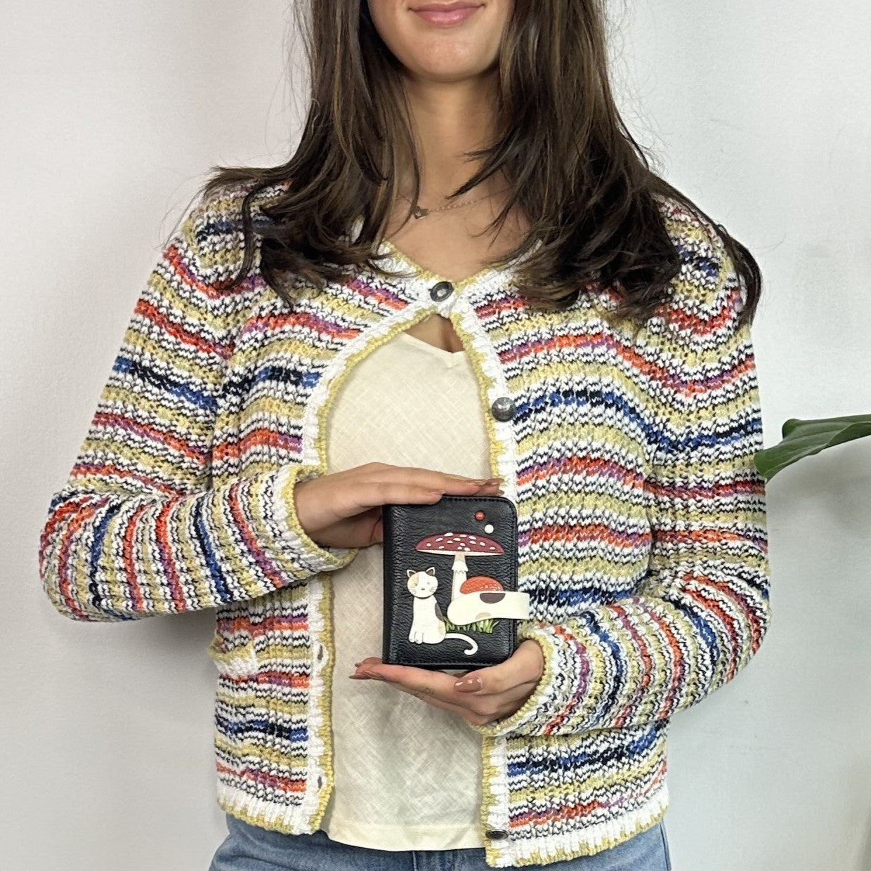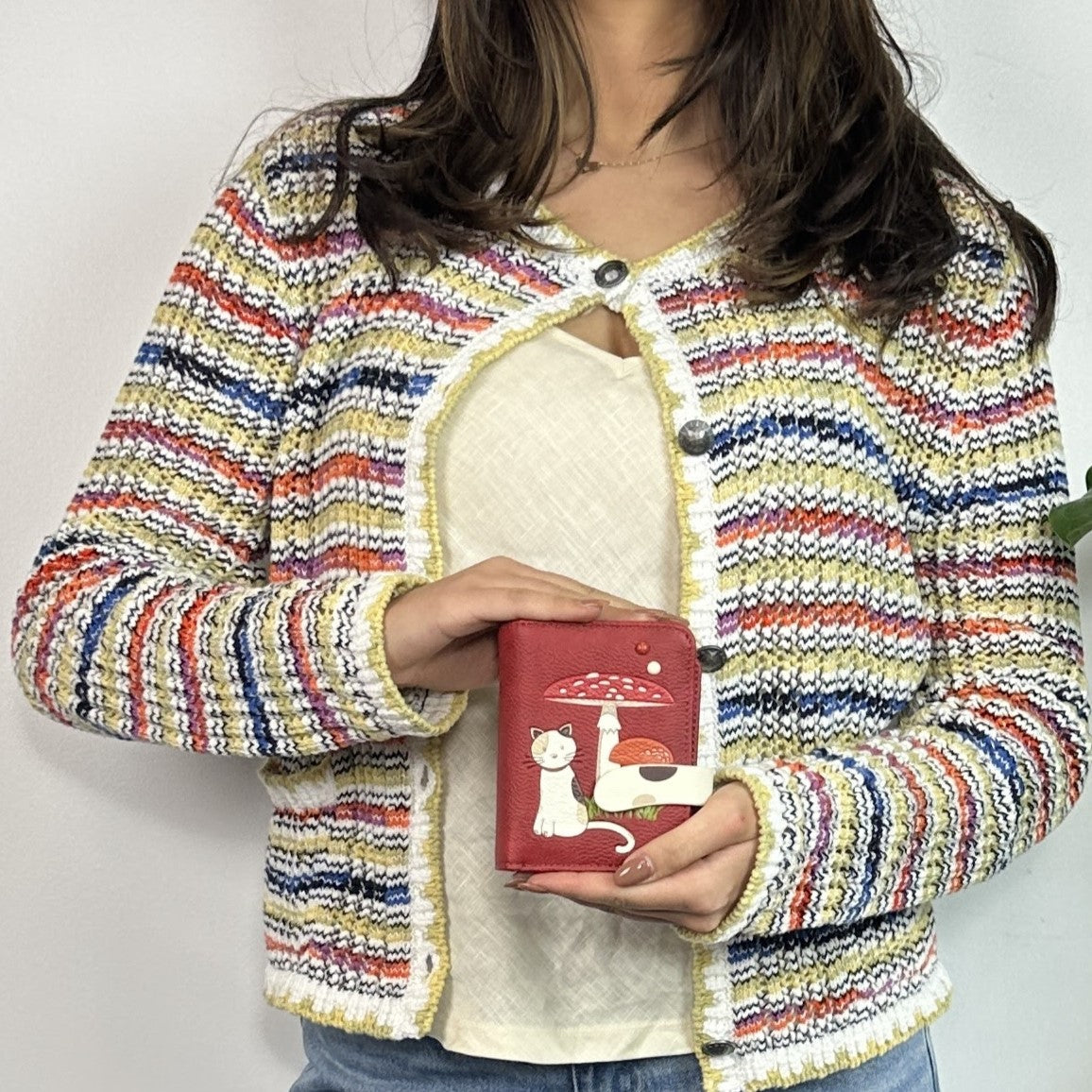 This compact wallet with a cute cat nestled in with the mushrooms has lots of room for cards and cash but fits into smaller bags for convenience. The pebbled vegan leather gives it an elevated look.