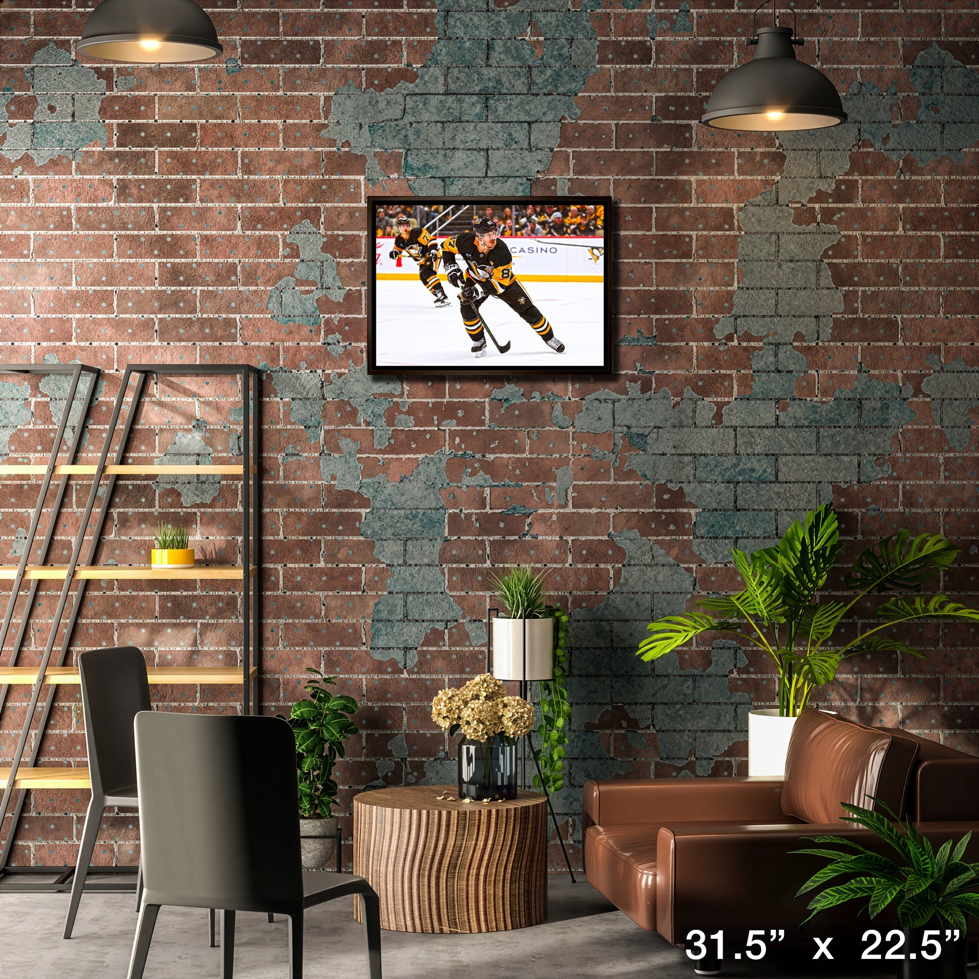 This image of Sidney Crosby is printed on high quality art canvas and then professionally stretched and framed. This canvas is officially licensed by the National Hockey League (NHL) and National Hockey League Players Association (NHLPA). Made in Canada.. Finished Size: 31.5 x 22.5"