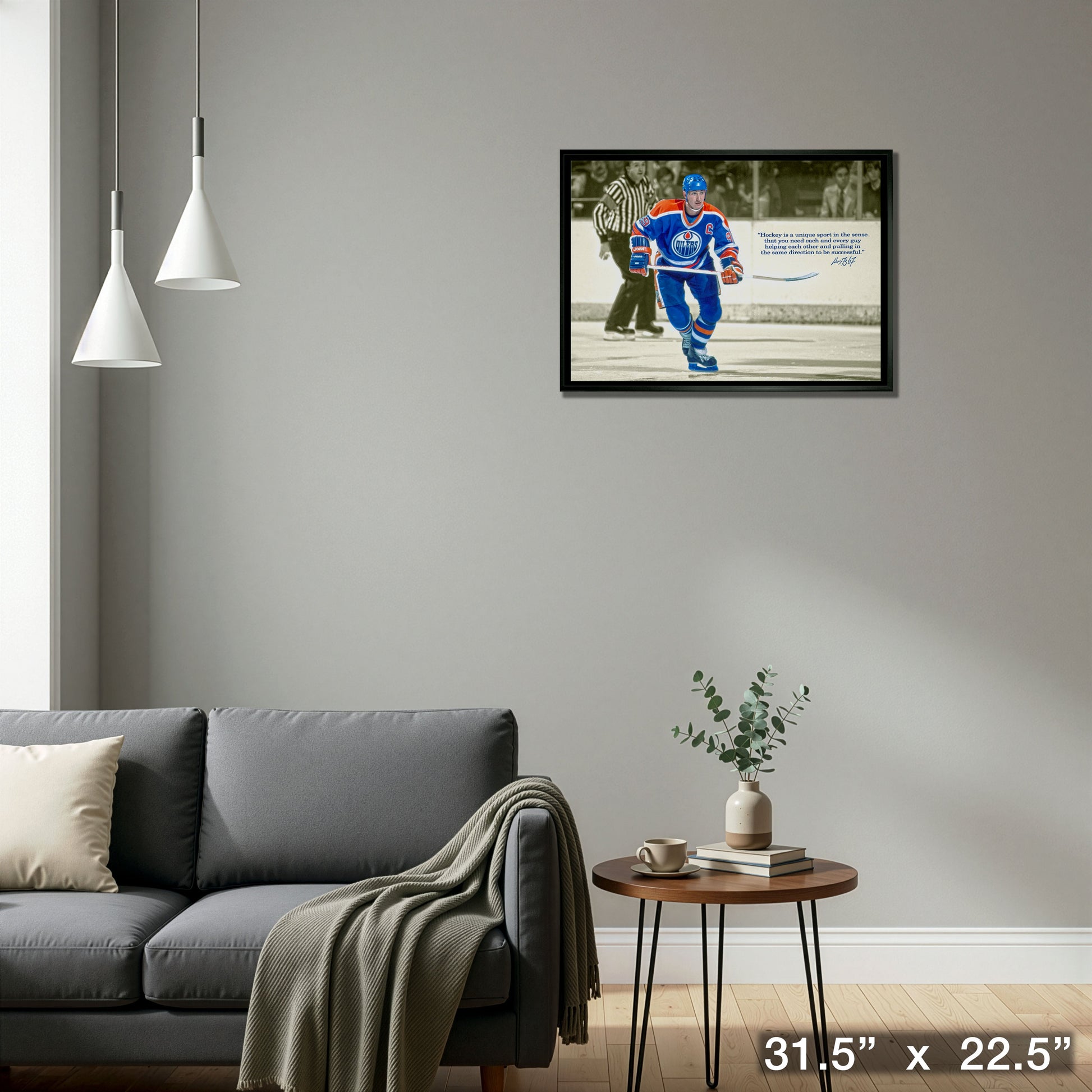 This unique canvas piece feathures Wayne Gretzky in action during his time with the Edmonton Oilers. Gretzky is often referred to as the "Great One", for his amazing accomplishments on the ice and numerous records that he set during his career. Gretzky won 4 Stanley Cups (all with Edmonton), and has the NHL records for goals, assits, points, points in a season and many others. Featured to the right of Grezky on this canvas piece is a quote from Wayne talking about the uniqueness of hockey and how each and every player is pulling in the same direction to drive towards success. Frameworth is an official licensee of the NHL. Finished size: 20X29" Made in Canada.