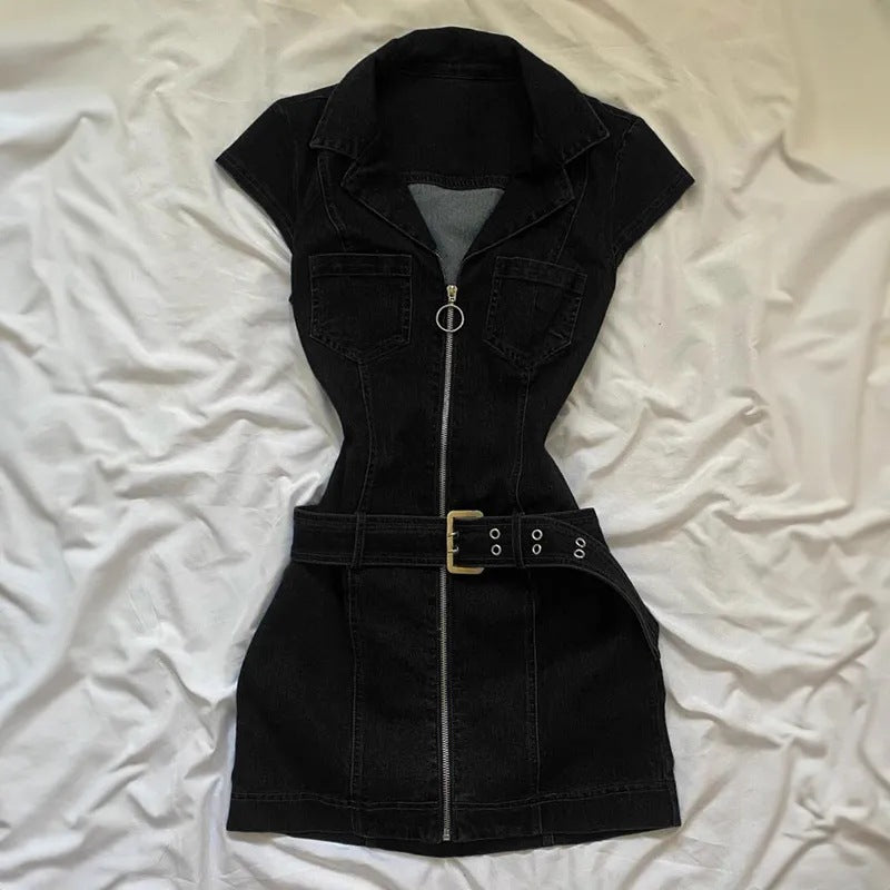 Own every room you walk into with this short sleeve bodycon denim mini dress. Crafted for women who lead with confidence, this zip front denim dress wraps your figure in a sleek, form-fitting silhouette that blends retro Korean/Japanese street style with everyday wearability. From casual outings to after-dark looks, this women's denim mini dress is the versatile statement piece your wardrobe needs.