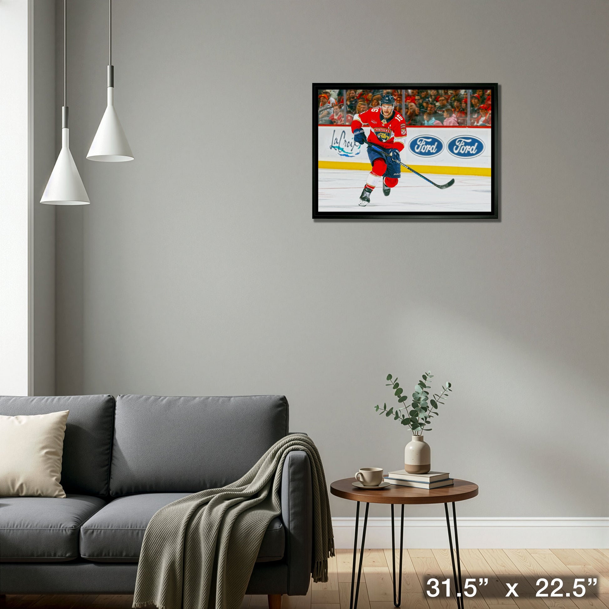 This image of Aleksander Barkov is printed on high quality art canvas and then professionally stretched and framed. This canvas is officially licensed by the National Hockey League (NHL) and National Hockey League Players Association (NHLPA). Made in Canada.. Finished Size: 31.5 x 22.5"