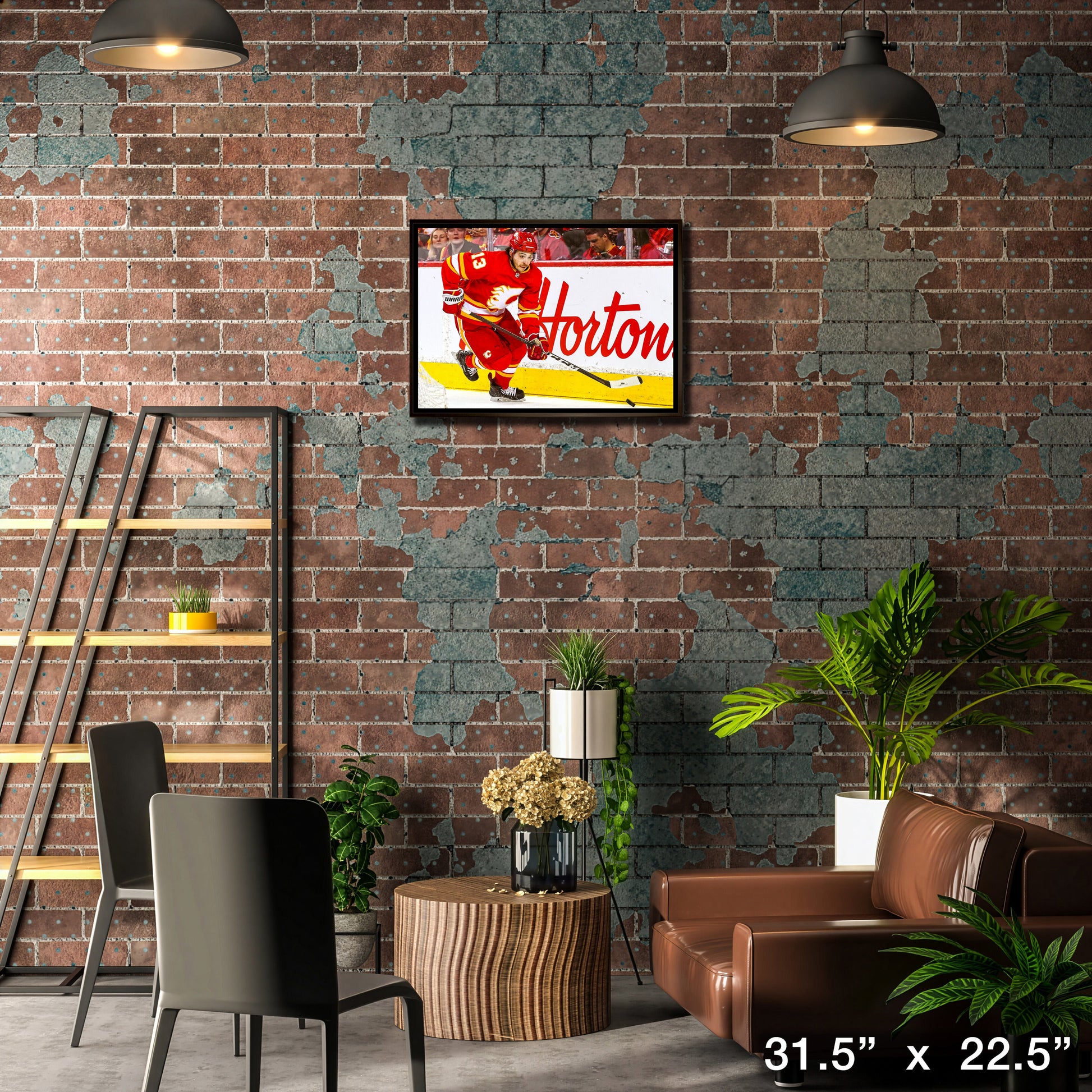 This image of Johnny Gaudreau is printed on high quality art canvas and then professionally stretched and framed. This canvas is officially licensed by the National Hockey League (NHL) and National Hockey League Players Association (NHLPA). Made in Canada.. Finished Size: 31.5 x 22.5"