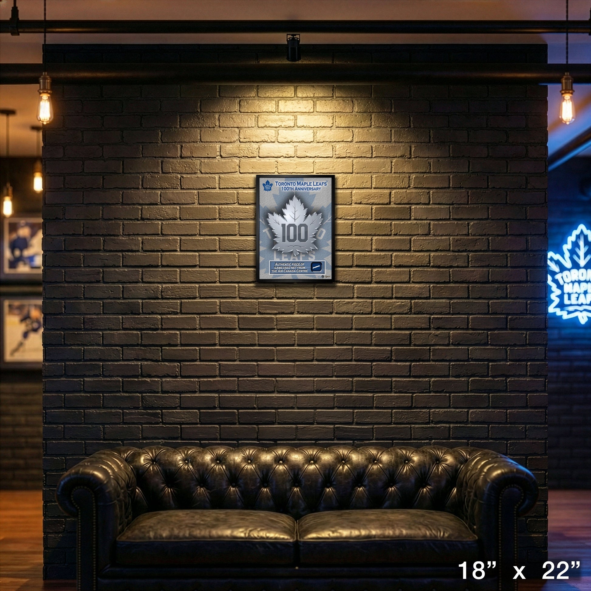 This 100th Anniversary Toronto Maple Leafs frame showcases the centennial logo framed alongside an authentic piece of game-used net from the centennial season. Finished Frame Size: 18x22"